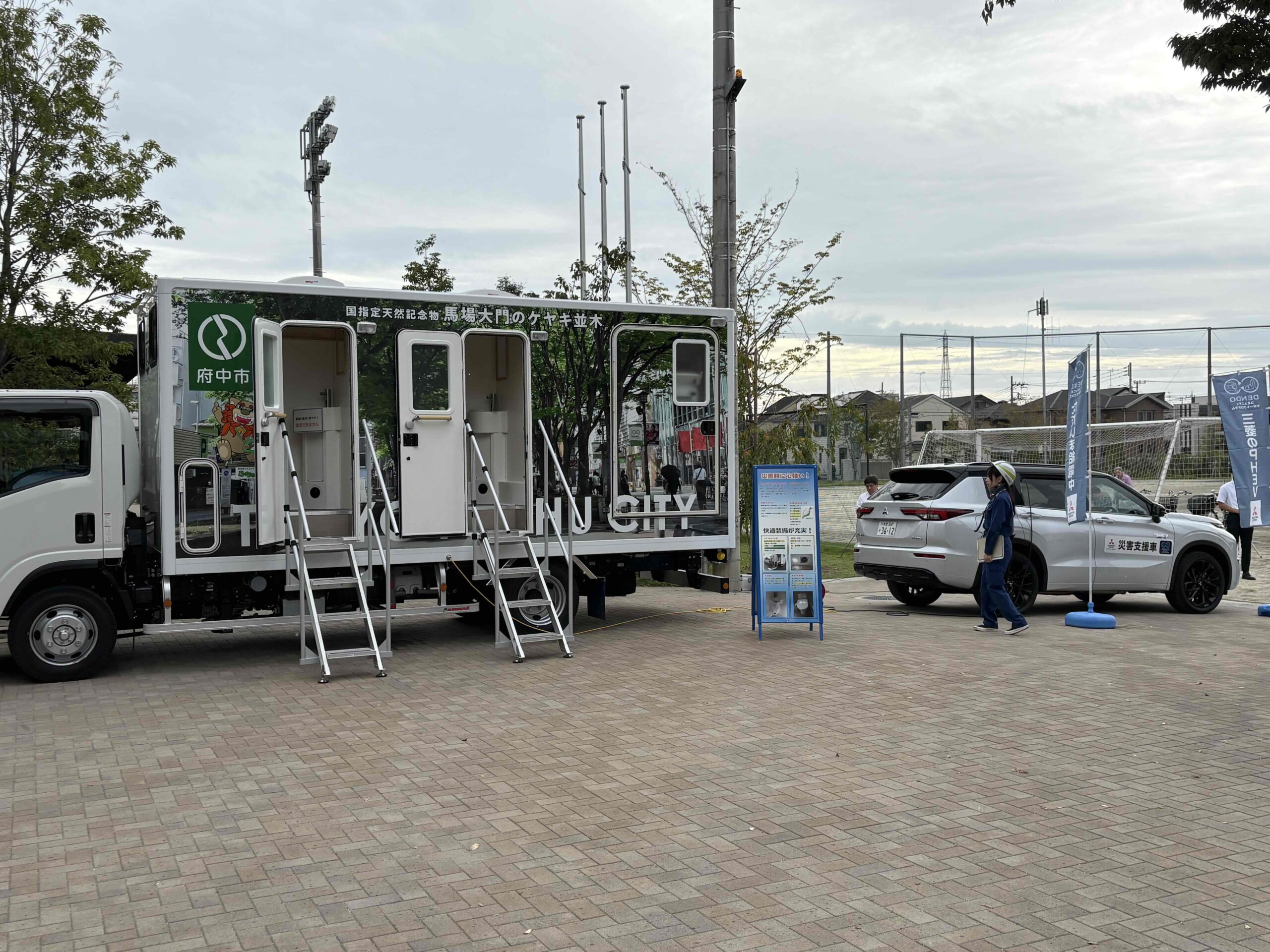 東日本三菱は給電車(アウトランダーPHEV)の車両展示を行うとともに、音響システム及び府中市が用意したトイレカーへの給電を行い、参加された市職員及び地域住民の皆様にその様子をご覧いただきました。また避難所運営に関する講話の中で、当社が作成した資料を基に、アウトランダーPHEVの防災時における強みについて約5分間の説明を実施しました。