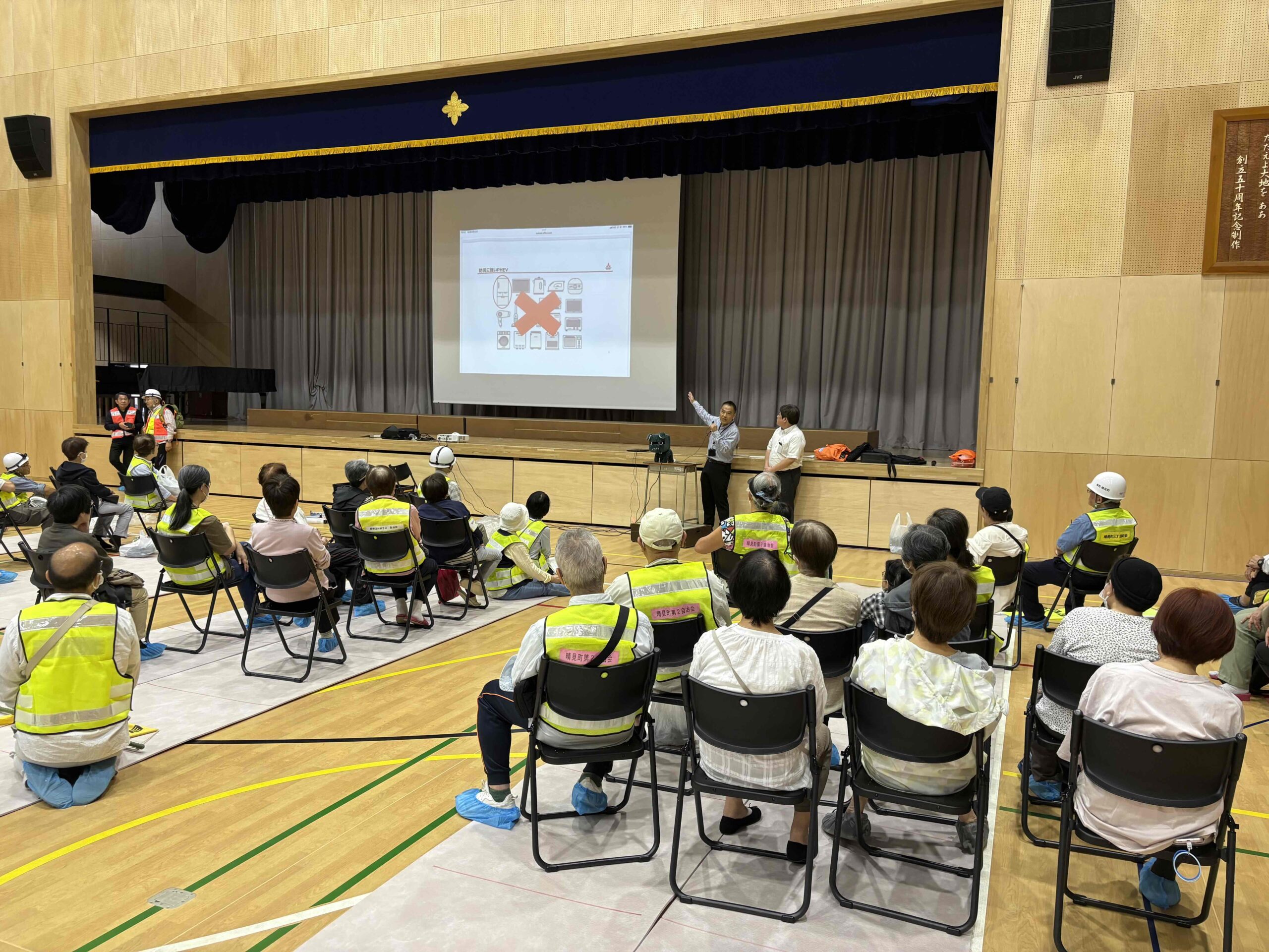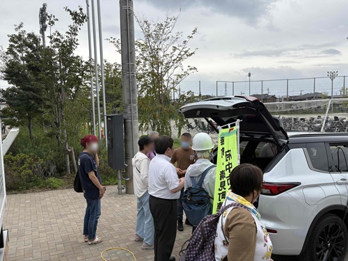 説明後には多くの訓練参加者がアウトランダーPHEVに興味を示され、実際に車両をご覧いただく機会となりました。特に、給電の仕組みやPHEVの構造に関する質問が寄せられるなど、防災に対する関心が高いことを感じました。