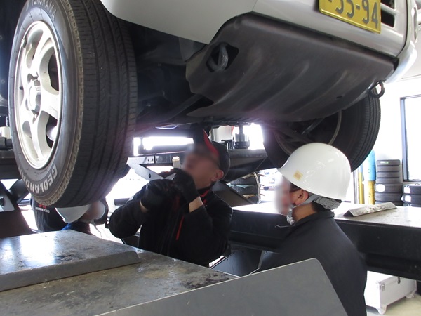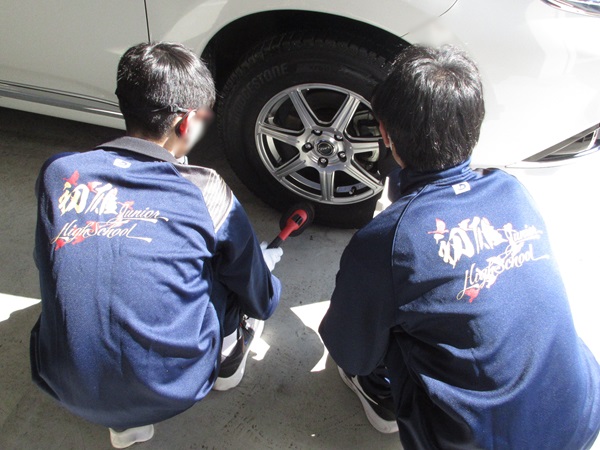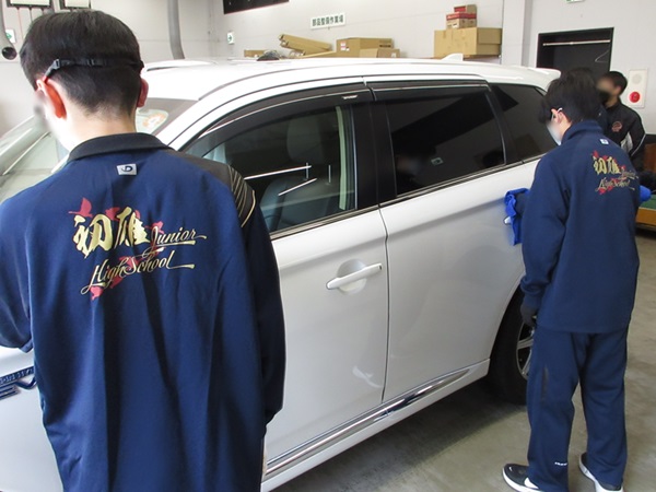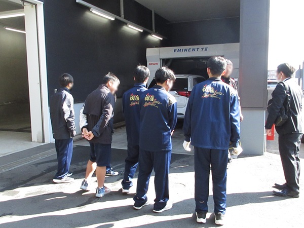 サービス工場では、点検作業の見学に加えて、先生のお車の洗車や自分たちの自転車用ヘルメットへのコーティング作業を行いました。生徒の皆さんはどの作業にも積極的に取り組んでいました。