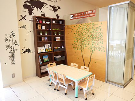 設備 キッズコーナー、授乳室、おむつ交換台、ベビーキープ、フリーWi-Fi、AED(自動体外式除細動器)