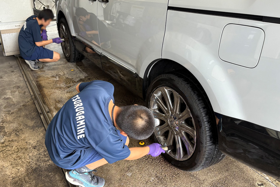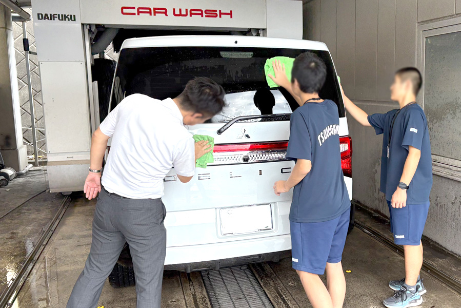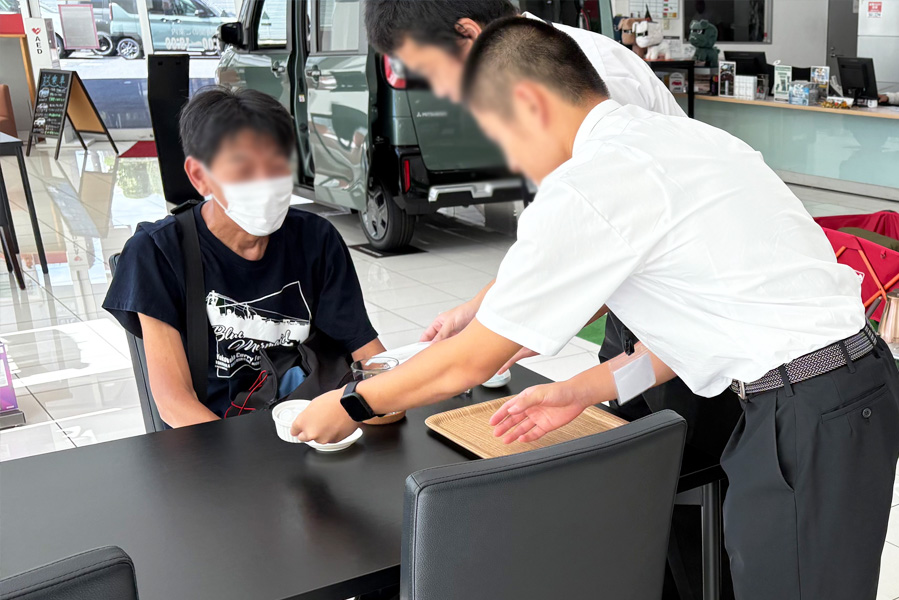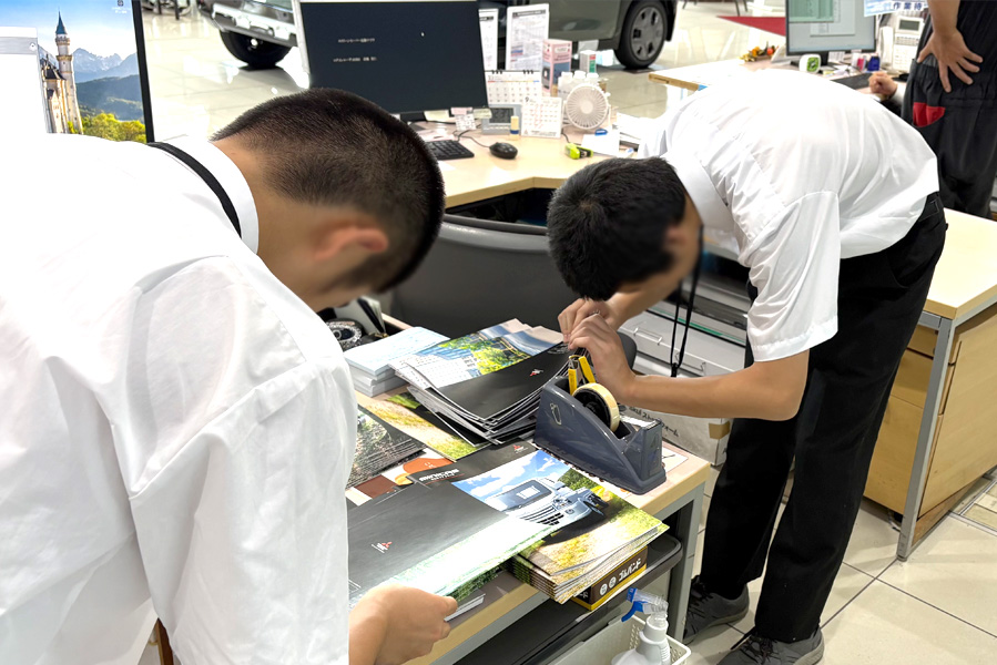 ショールームではご来店のお客様へのご挨拶やお飲物のご提供、片付け、カタログの整理、サービス工場では作業の見学や洗車のお手伝いをしていただきました。中学生の初々しい対応にショールームにお越しのお客様も温かい眼で見守ってくださいました。