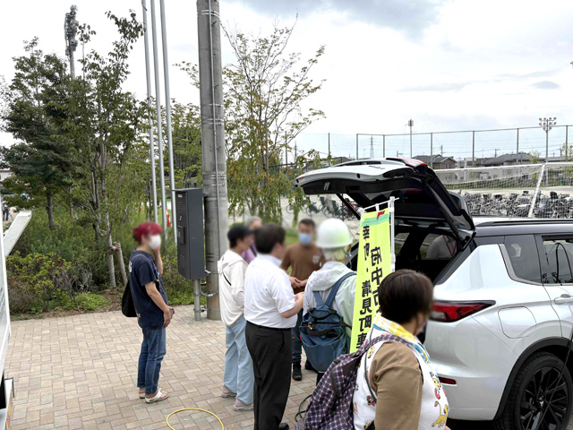 説明後には多くの訓練参加者がアウトランダーPHEVに興味を示され、実際に車両をご覧いただく機会となりました。特に、給電の仕組みやPHEVの構造に関する質問が寄せられるなど、防災に対する関心が高いことを感じました。