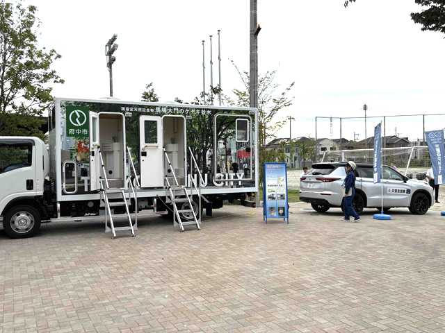 東日本三菱は給電車(アウトランダーPHEV)の車両展示を行うとともに、音響システム及び府中市が用意したトイレカーへの給電を行い、参加された市職員及び地域住民の皆様にその様子をご覧いただきました。また避難所運営に関する講話の中で、当社が作成した資料を基に、アウトランダーPHEVの防災時における強みについて約5分間の説明を実施しました。