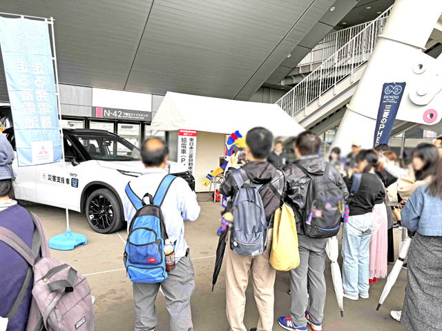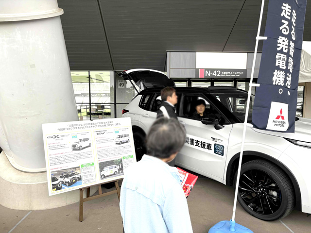 東日本三菱は給電車(アウトランダーPHEV)の車両展示を行うとともに、給電デモンストレーションを実施、モニター・電気ケトル・サーキュレーターを使用して、災害時の活用例を紹介しました。