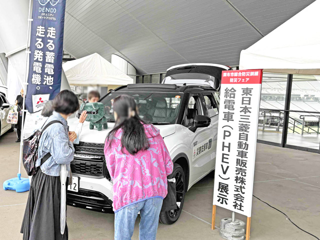 10月11日(土)東日本三菱自動車販売株式会社(以下、東日本三菱)は、東京都調布市味の素スタジアムで開催された令和7年度調布市総合防災訓練・防災フェアに、給電車(アウトランダーPHEV)給電デモで参加しました。